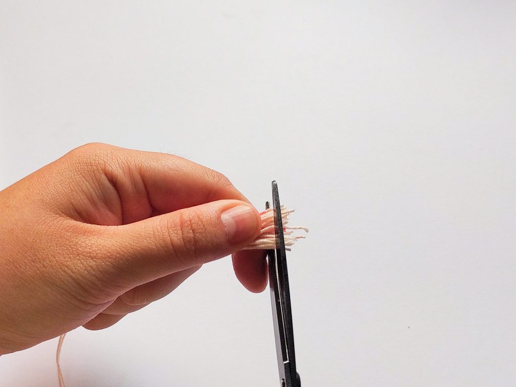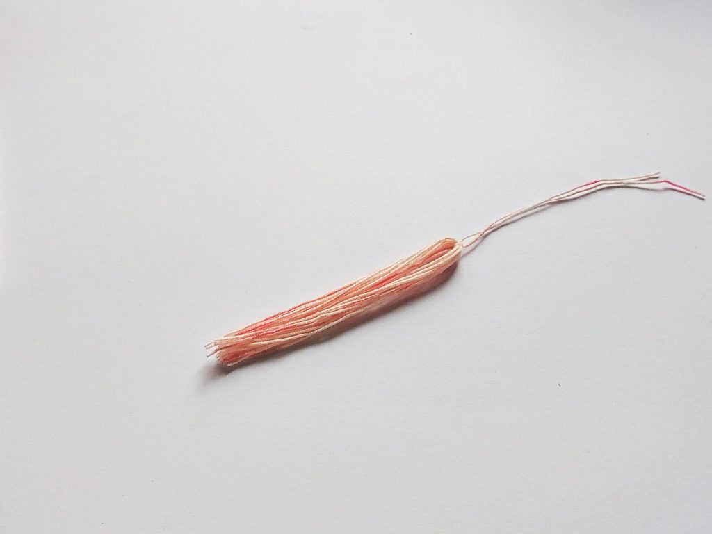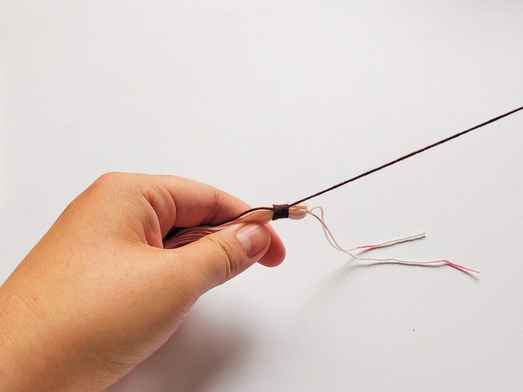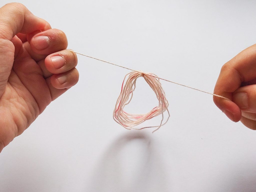 接著我們要製作流蘇上面綁緊的部分,另外剪一條20公分的線作為綁線,可以使用同一種顏色,但這邊方便示範我用深色線替代。