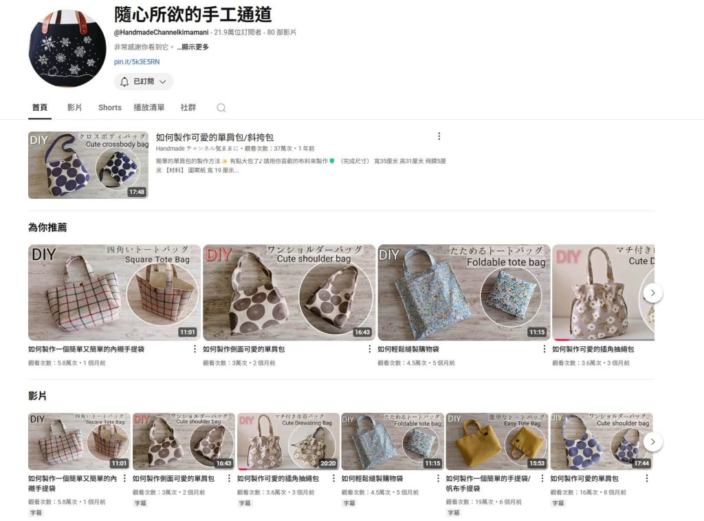 這是一個我很喜歡的日本布作教學頻道,裡面的教學沒有太過繁複的版型,但只要挑選適合的布料,做出來的效果就很棒!